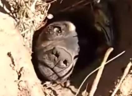 Outros animais tentavam cavar a terra para ajudar o animal a sair do buraco. Um homem que passava pelo local, viu a situação e correu para ajudar a resgatar o cãozinho.