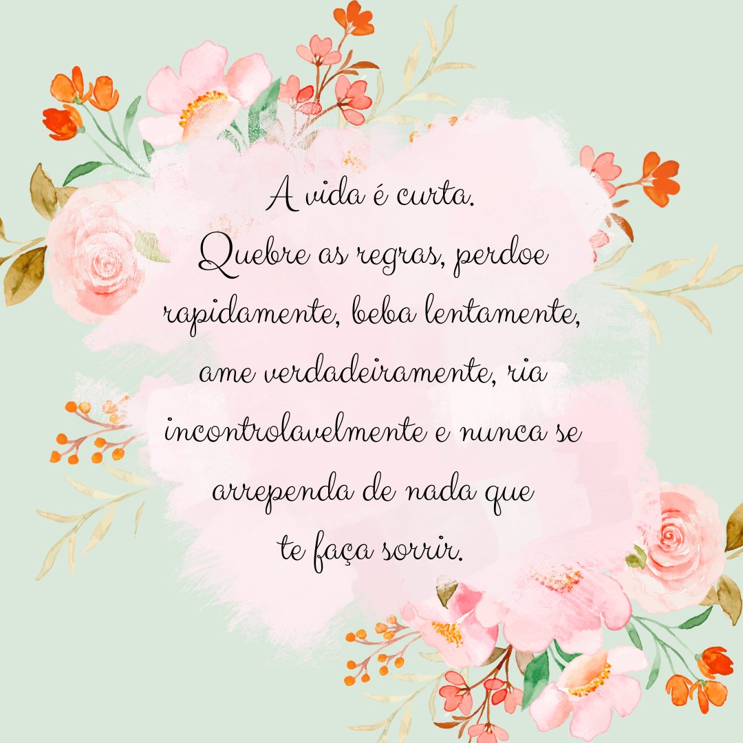 A vida é curta. Quebre as regras, perdoe rapidamente, beba lentamente, ame verdadeiramente, ria incontrolavelmente e nunca se arrependa de nada que te faça sorrir.