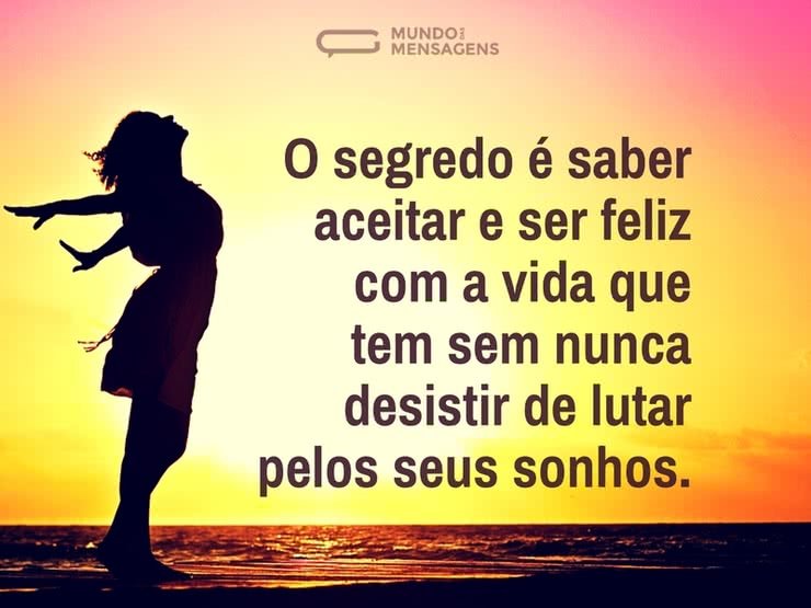 O segredo é saber aceitar e ser feliz com a vida que tem sem nunca desistir de lutar pelos seus sonhos. Fonte: Mundo das Mensagens