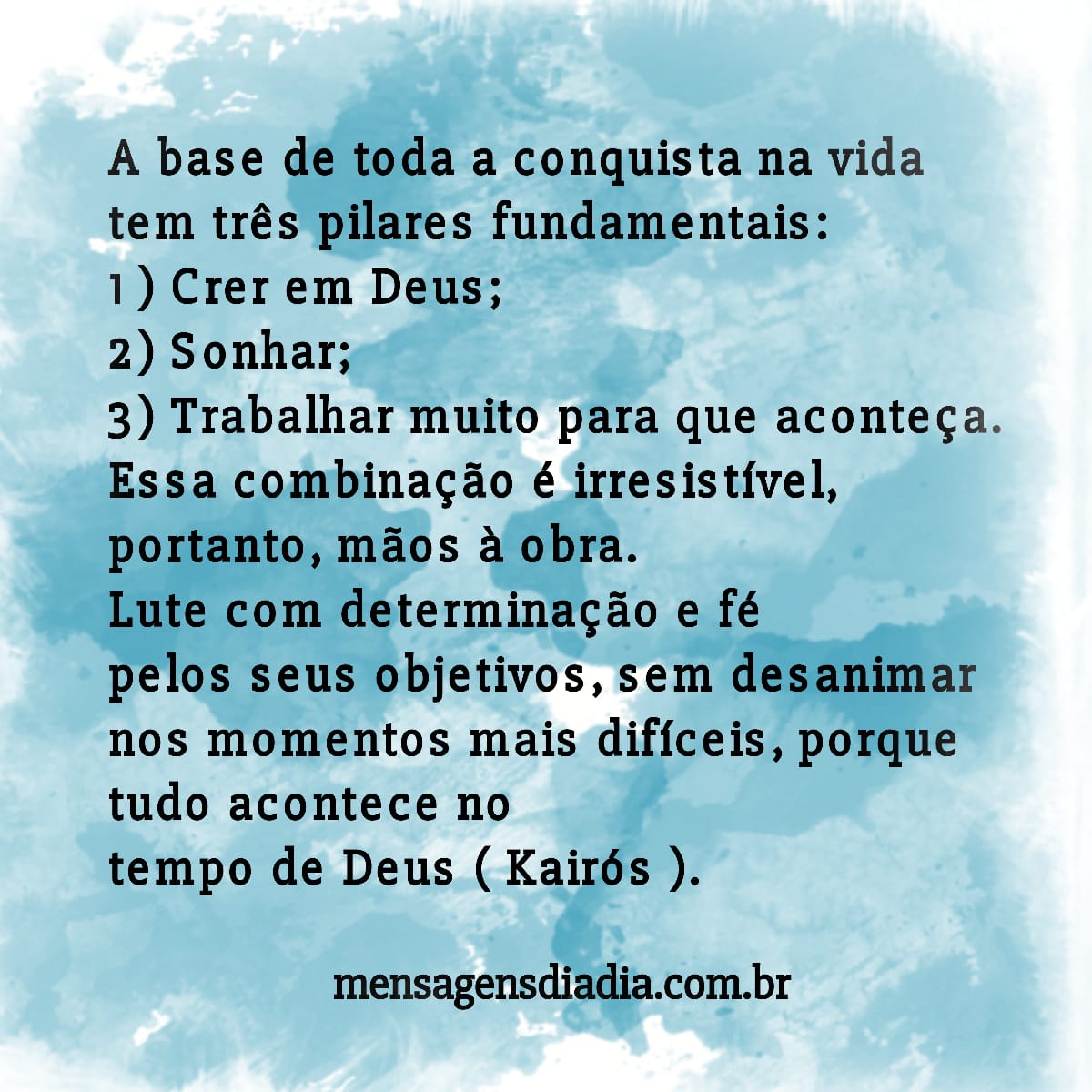 A base de toda a conquista na vidatem três pilares fundamentais:1) Crer em Deus;2) Sonhar;3) Trabalhar muito para que aconteça.Essa combinação é irresistível,portanto, mãos à