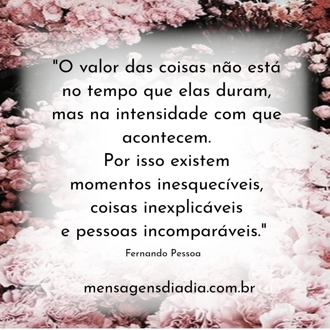 “O valor das coisas não está no tempo que elas duram, mas na intensidade com que acontecem. Por isso, existem momentos inesquecíveis, coisas inexplicáveis e pessoas incomparáveis” (Fernando Pessoa).