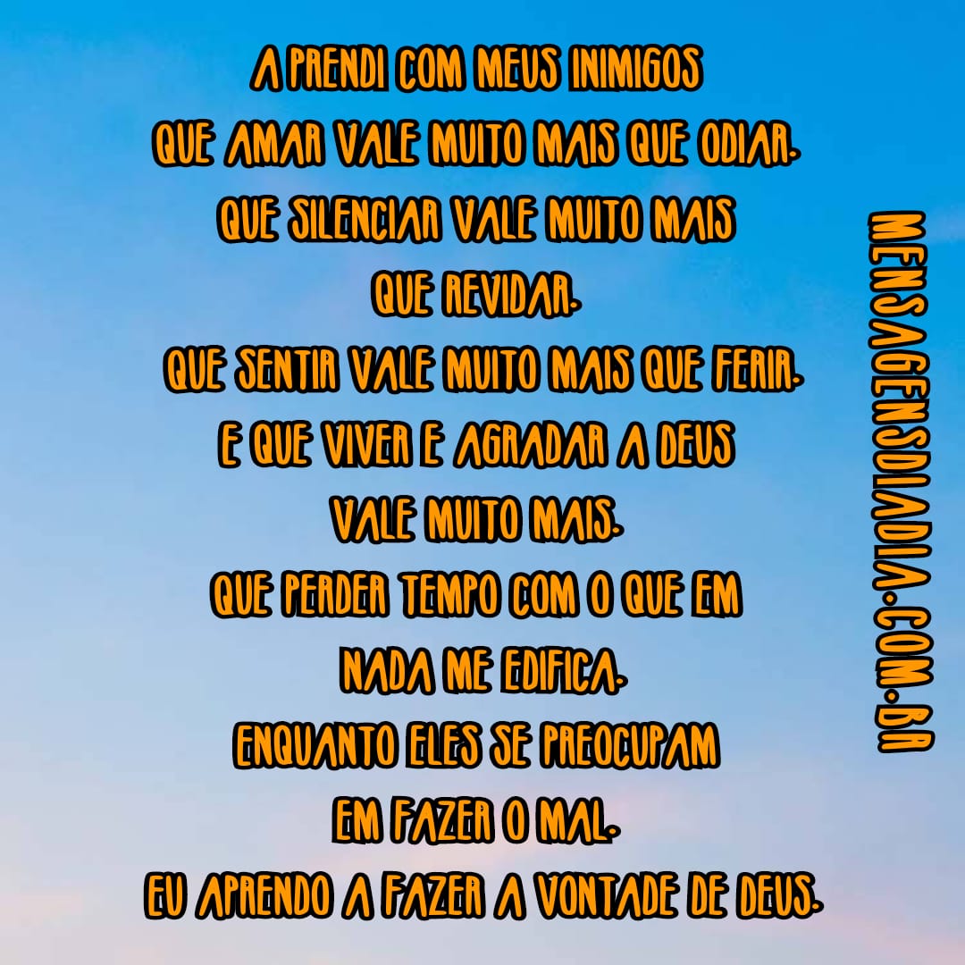Aprendi com meus inimigos que amar vale muito mais que odiar. Que silenciar vale mais que revidar. Que sentir vale muito mais que ferir. E