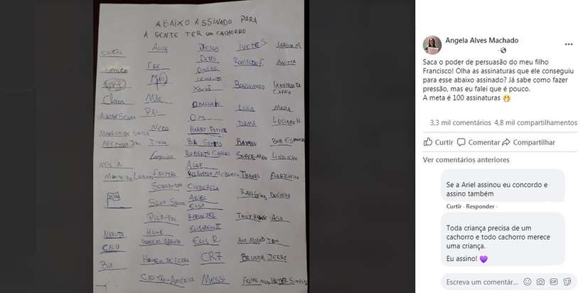 Adolescente reuniu diversas ‘assinaturas’, entre elas de Bill Gates, Anitta, Neymar, Messi e Cristiano Ronaldo, pra convencer a mãe a adotar um cachorro A criatividade de um