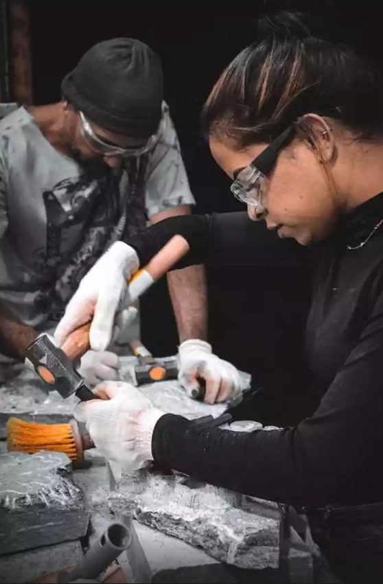 Os olhos se mantêm atentos ao tirar “arte da pedra”. As mãos, firmes, acompanham o movimento do torno, enquanto as cores se misturam no ritmo