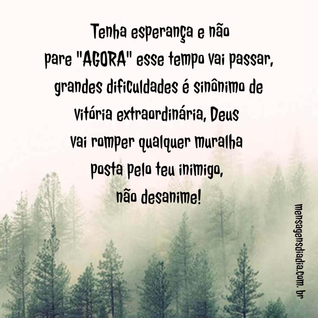 Tenha esperança e não pare “AGORA” esse tempo vai passar, grandes dificuldades é sinônimo de vitória extraordinária, Deus vai romper qualquer muralha posta pelo teu inimigo, não desanime!