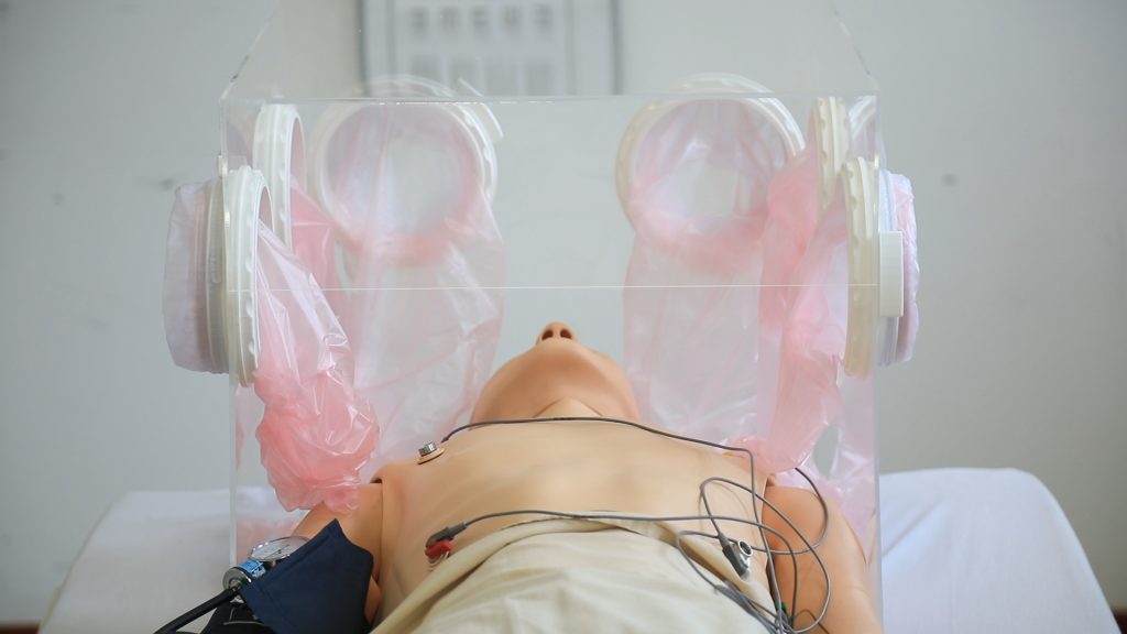 Batizado com um nome gigante – Dispositivo de proteção acrílica para uso durante o gerenciamento de vias aéreas em pacientes com coronavírus – o invento é relativamente simples. Trata-se de uma caixa feita de acrílico, que permite o acesso simultâneo de três profissionais, além de ampliar a quantidade e qualidade de barreiras que protegem a equipe médica do contato com secreções e gotículas que são liberadas pelo paciente durante o procedimento.