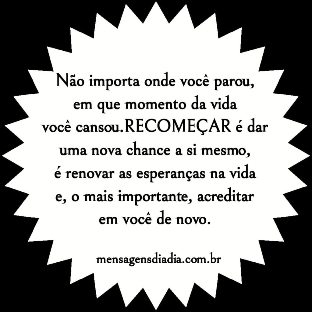Não importa onde você parou, em que momento da vida você cansou. RECOMEÇAR é dar uma nova chance a si mesmo, é renovar as esperanças na vida e, o mais importante, acreditar em você de novo.