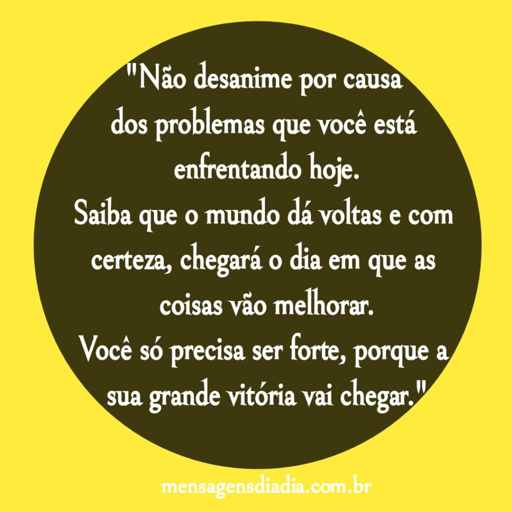 “Não desanime por causa dos problemas que você está enfrentando hoje. Saiba que o mundo dá voltas e com certeza, chegará o dia em que as coisas vão melhorar. Você só precisa ser forte, porque a sua grande vitória vai chegar.”