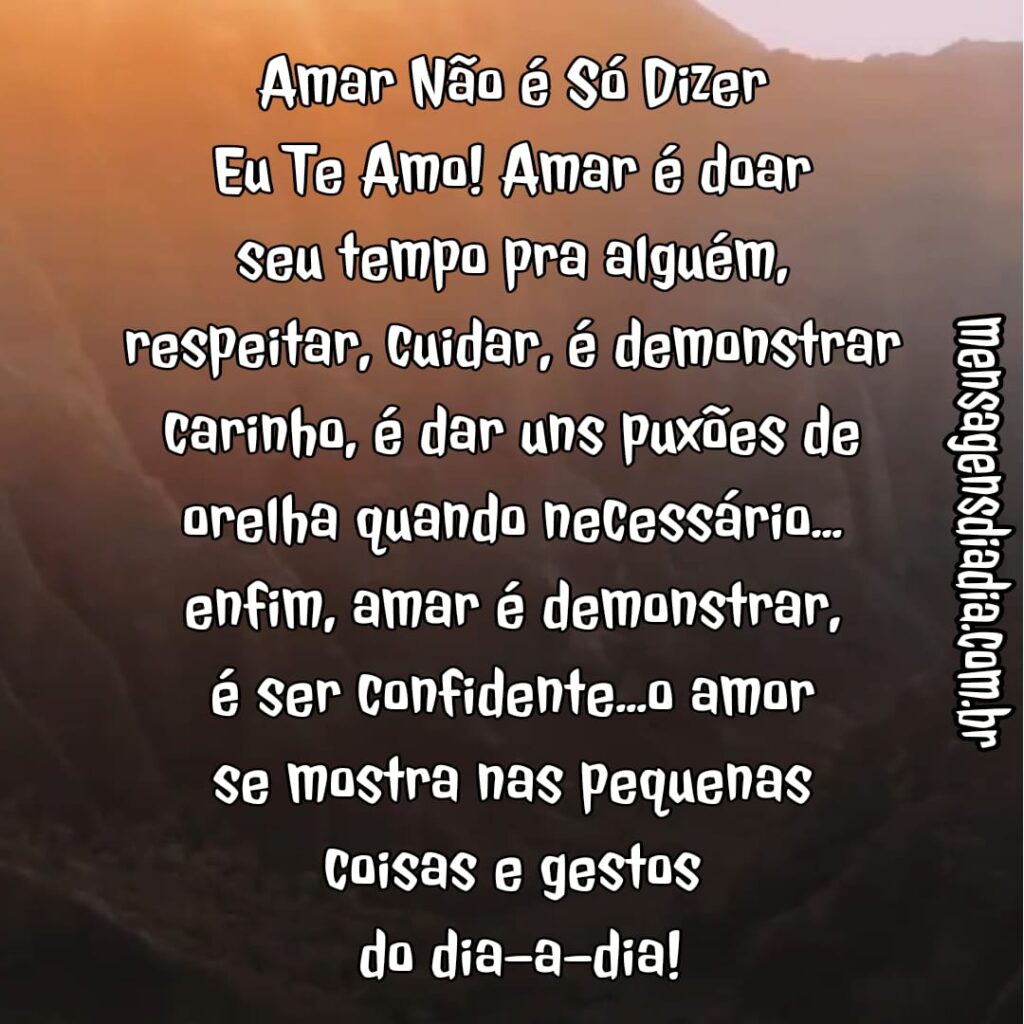 Amar não é só dizer Eu te amo! Amar é doar seu tempo para alguém, respeitar, cuidar, é demonstrar carinho, é dar uns puxões de orelha quando necessário….enfim, amar é demonstrar, é ser confidente…..o amor se mostra nas pequenas coisas e gestos do dia-a-dia!