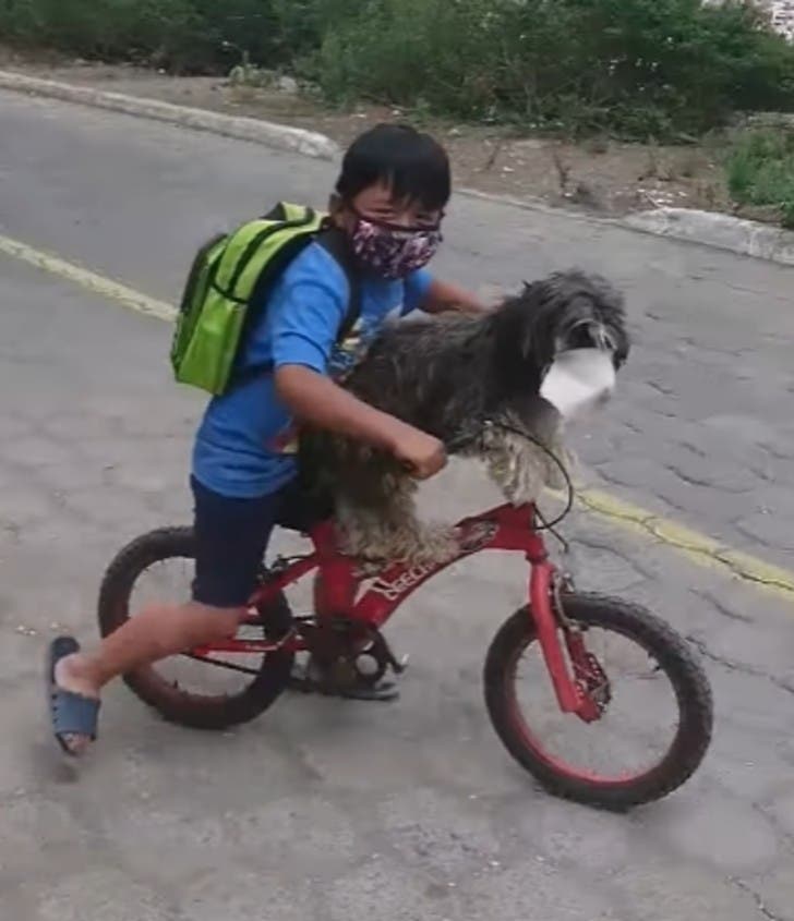 Ciente das medidas sanitárias necessárias para se proteger, o menino pôs seu melhor amigo em sua bicicleta e colocou uma máscara nele para evitar que ele pegasse a doença. E ele fez isso antes mesmo de proteger a si mesmo.