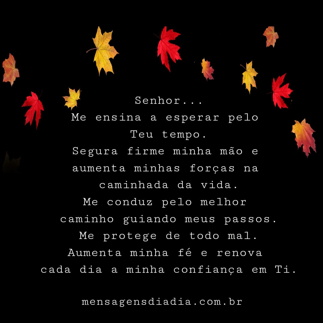 Senhor me ensina a esperar pelo Teu tempo. Segura firme minha mão e aumenta minhas forças na caminhada da vida. Me conduz pelo melhor caminho