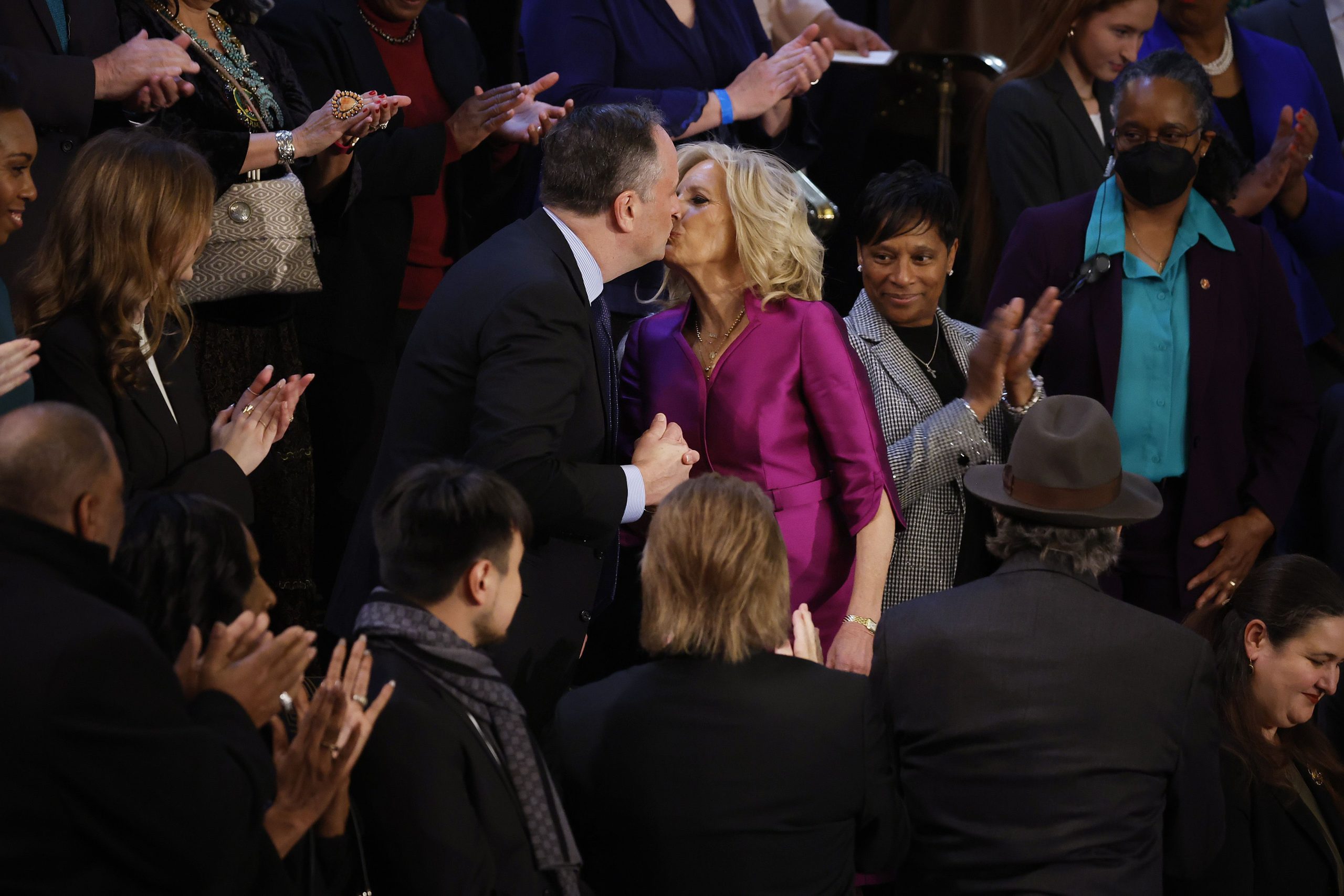 A primeira-dama dos Estados Unidos, Jill Biden, e o marido da vice-presidente Kamala Harris, Doug Emhoff, se cumprimentaram com um beijo na boca durante um evento no