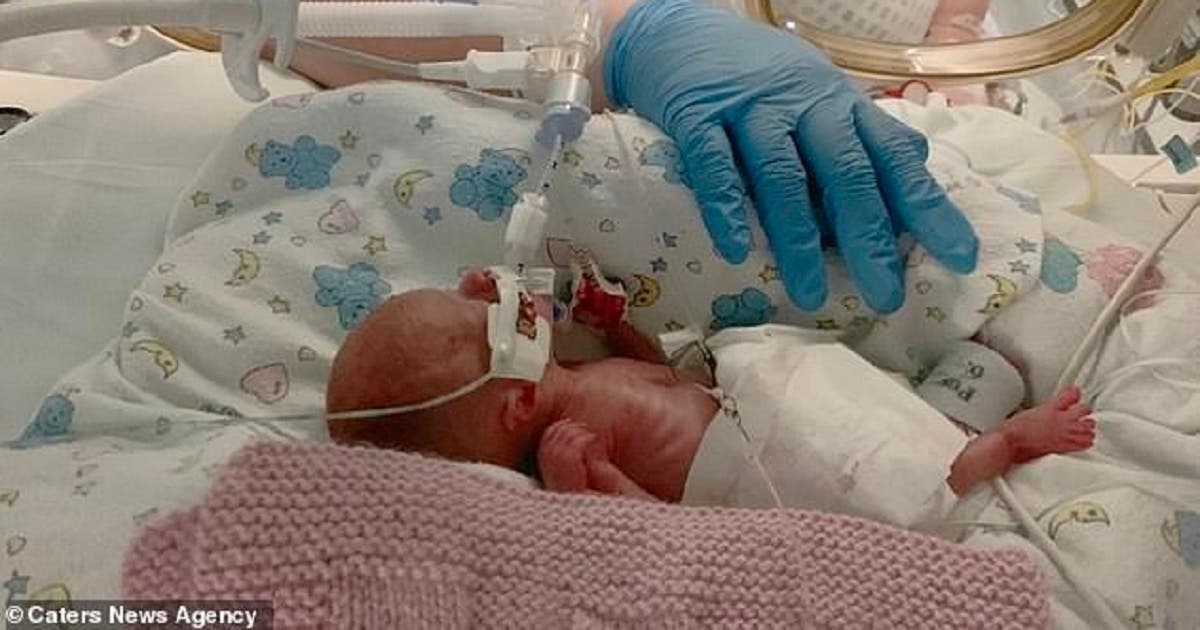 A pequena Orla-May Rospo-Hughes pesava apenas 497 gramas quando nasceu no mês passado, após apenas 27 semanas de gravidez. Emily Rospo e Samantha Hughes, que