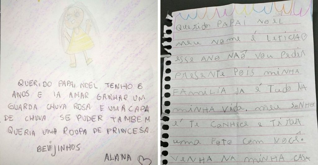 “Querido Papai Noel, meu nome é Letícia. Esse ano não vou pedir presente pois minha família é tudo na minha vida. Meu sonho é te conhecer e tirar uma foto com você. Venha na minha casa. Um grande abraço.”