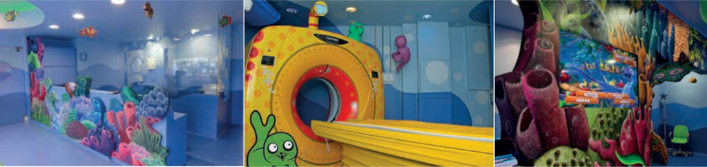 Todas as salas de quimioterapia e de exames foram redesenhadas visualmente para lembrar o fundo do mar igual a aquários. As paredes coloridas foram decoradas com peixes e plantas aquáticas. E os equipamentos são personalizados para parecerem submarinos e cores frias, como o azul, predominam no ambiente com o objetivo de trazer calma ao paciente.