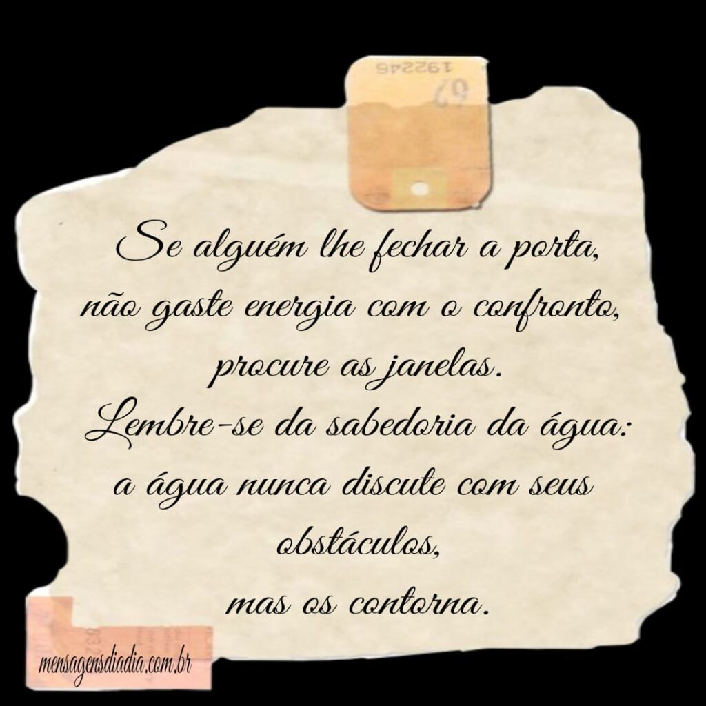 Se alguém lhe fechar a porta, não gaste energia com o confronto, procure as janelas. Lembre-se da sabedoria da água: a água nunca discute com seu obstáculos, mas os contorna.