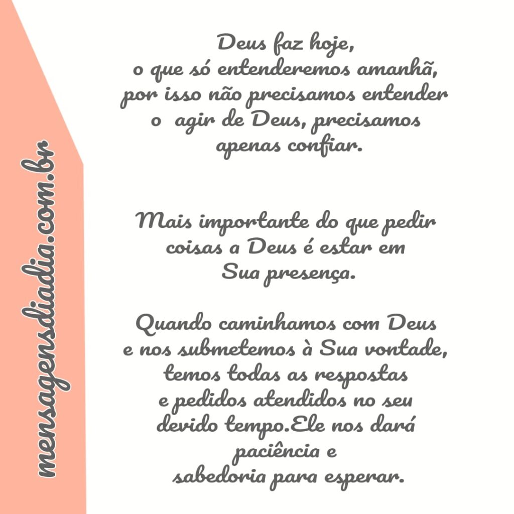 Deus faz hoje, o que só entenderemos amanhã, por isso não precisamos entender o agir de Deus, precisamos apenas confiar. Mais importante que pedir coisas a Deus é estar em sua presença. Quando caminhamos com Deus e nos submetemos à sua vontade, temos todas as respostas e pedidos atendidos no seu devido tempo. Ele nos dará paciência e sabedoria para esperar.